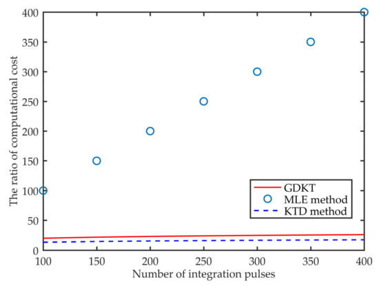 Extractions of the dimension at ambiguity integers are also plotted with the red line in the top left figure of Figure 3. As analyzed above, the signal energy distribution along can be seen as extractions of the dimension at ambiguity integers. Based on Equations (14) and (19), and related analyses and results shown in Figure 2 and Figure 3, it is not difficult to find that the KTD method and the MLE method have the same energy integration, while the searching range of is fixed into and the searching procedure for can be speed up via the fast Fourier transform (FFT) [24,25,26,29,30,31,32,33,34,35]. That is, these two methods have the same energy integration, while the KTD method is more computationally efficient than the MLE method.
