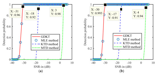The radar and target parameters are the same as those in Table 2. The simulated radar data is contaminated by the zero-mean white Gaussian noise and the input SNRs are set as [−40:1: 10] dB. 1000 trials are done for each input SNR value. Figure 9a–c shows the detection probabilities under the false alarm rates 10−5, 10−6, and 10−7, respectively. The MLE method, KTD method, and MTD method are used as comparisons.