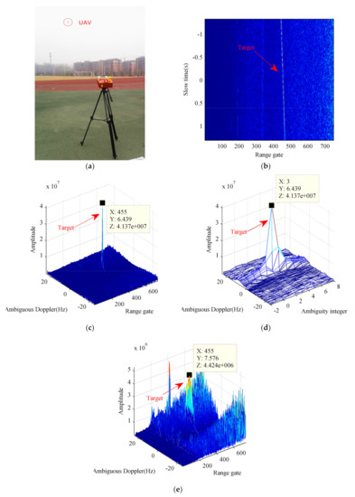 Experiment scene and real radar data processing results. (a) Experiment scene. (b) Result of range compression. (c) Range-ambiguous Doppler slice of the GDKT. (d) Ambiguous Doppler-ambiguity integer slice of the GDKT. (e) Integration result of the MTD method.