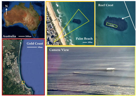 y points were obtained at a very low tide of 0 m LAT (Southport predicted tide data) by simultaneous video recording and surveying of the field of view with an RTK GPS mounted on a kayak. The GPS was mounted on a pole, such that the bottom of the pole at the kayak waterline provided visual data at the low tide level, and the top of the GPS provided visual data at the tide level +1 m. On the 17th of September 2020, a total of 10 GPS points were collected over and around the reef and around the adjacent nearshore region. A further 3 GPS points were collected at the mean water level at the shoreline. This survey methodology enabled generation of homography matrices for different tide levels from a single survey. The homography matrix for any tide was approximated by using sets of