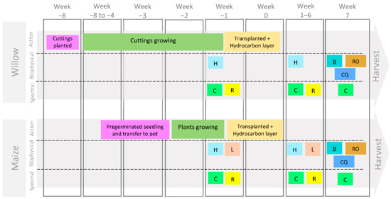 Experiment steps (Action), biophysical and spectral data collection for willow and maize. (L = leaf number, including colour; H = plant height, C = chlorophyll measured with MultispeQ, R = reflectance measured with ASD FieldSpec® Pro 3, B = total plant biomass, RO = root observations, CQ = chemical analysis of chlorophyll).
