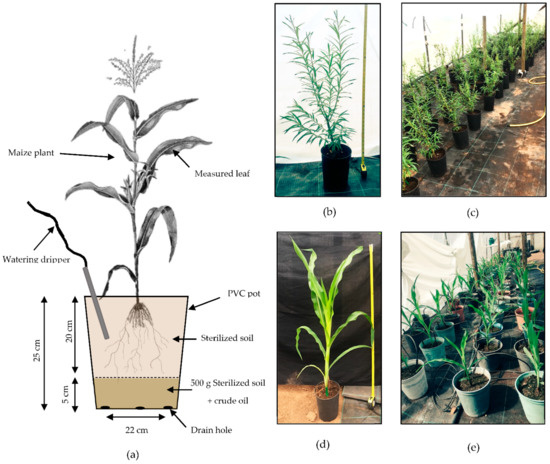 (a) Schematic diagram of a maize plant set up in the experiment. (b) Willow tree after 8 weeks of growth before the addition of the crude oil polluted layer (1 m tape). (c) Distribution of willow trees in the polytunnel during the experiment. (d) Maize plant after 5 weeks of growth with no crude oil pollution layer in the pot (1 m tape). (e) Distribution of maize plants in the polytunnel during the experiment. (Plant diagram modified from https://upload.wikimedia.org/wikipedia/commons/0/0c/PSM_V82_D230_Maize_and_its_proposed_asiatic_origin.png, accessed on 12 May 2021; unknown author, public domain via Wikimedia Commons).