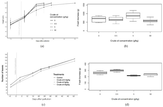 Height of all the crude oil treatments of willow trees before and until 50 days of the addition of the polluted layer. (b) Fresh biomass of crude oil treatments of willow trees at the end of the experiment after 50 days of pollution. (c) Number of leaves in crude oil treatments of maize plants before and until 50 days of the addition of the polluted layer. (d) Fresh biomass of crude oil treatments of maize plants at the end of the experiment after 50 days of pollution. Bars in (a,c) represent the standard error.