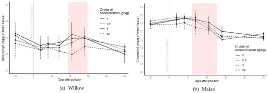 Chlorophyll content in willow (a) and maize (b) for all the crude oil treatments before and until 50 days the addition of the polluted layer. The red square highlights the period of significant differences between treatments. Bars represent the standard error.