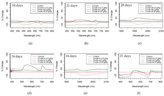 Ratios of reflectance change of crude oil treatments respect to control treatments in willow (a–c) and maize plants (d–f) in different parts of the spectra and on different days of the experiment. Red line representing the control was calculated using the standard deviation as is indicated in Equation (1).