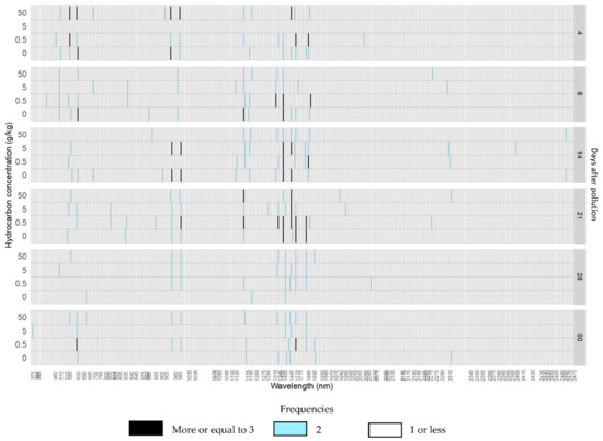 Histogram of the frequencies of absorption features detected in each wavelength position for each hydrocarbon concentration from 4 to 50 days after the addition of the crude oil polluted layer in willow trees.