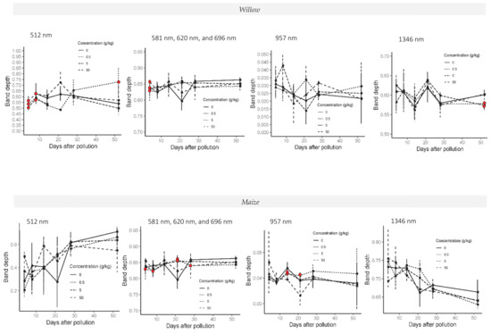 Band depth time series in 512, 620, 957, and 1346 nm absorption features in willow (top line charts) and maize plants (bottom line charts) during the whole experiment in crude oil treatments. Red dots indicate the treatments with significant differences relative to the control treatment. Last spectral measurement of willow was 52 days after the addition of the pollution and last day in the maize experiment was 50 days after the addition of the pollution.