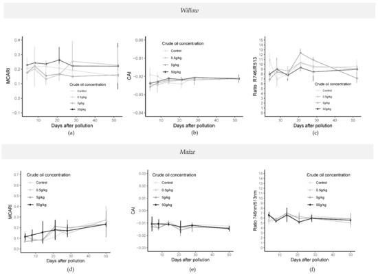 Time series of vegetation indices MCARI (a,d), CAI (b,e), and RARS (c,f) in crude oil treatments in willow (top) and maize (bottom) from 4 days after the addition of the polluted layer until 50 days later. (MCARI: modified chlorophyll absorption reflectance index, CAI: cellulose absorption index). Last spectral measurement of willow was 52 days after the addition of the pollution and last day in the maize experiment was 50 days after the addition of the pollution.