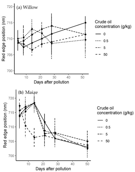 Spectral changes produced by the presence of hydrocarbons in the soil were mainly located in the VIS and the SWIR. A decrease of reflectance was associated with low polluted treatments and an increase in reflectance observed with high polluted treatments. Comparing the two plant species, maize had a larger range of spectral responses than willow in the SWIR, especially after 14 days of pollution. Absorption features were all related to plant pigments and biomass-related components. Crude oil impacted more in biomass-related absorption features during the first weeks of pollution and refined oil in chlorophyll absorption features. Chlorophyll-related indices CARI, MCARI, and CAI were the best indices for soil pollution discrimination. Red edge shifts towards shorter wavelengths were found in high polluted treatments and towards longer wavelengths in low polluted treatments in both species. The spectral absorption features and vegetation indices appeared consistent with the biophysical changes observed produced by the presence of hydrocarbons.