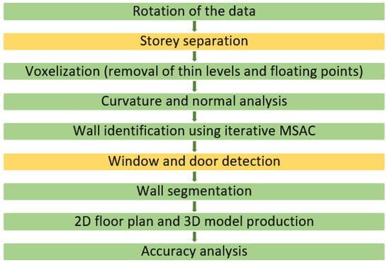 The novel strategies developed in this work for storey segmentation and door and window detection are contained within the complete end-to-end modelling strategy for automatically creating 2D floor plans and 3D building models from point clouds. The complete methodology is presented in Figure 1.
