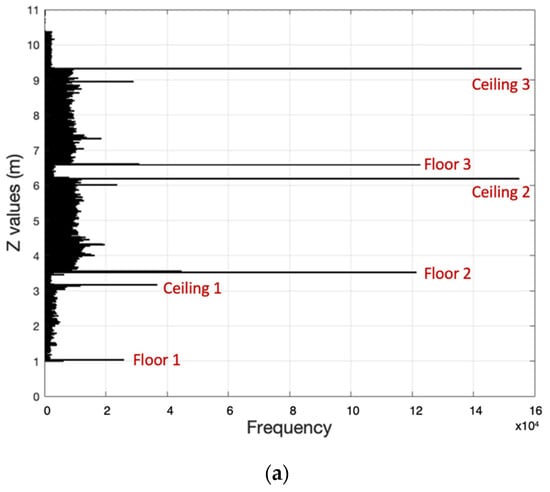 Figure 2 shows the difference in vertical histograms between a building with three single-level storeys (Figure 2a) compared to a building with four multi-level storeys (Figure 2b). It is evident from Figure 2 that the heights of full bins extracted from a vertical histogram are not enough to identify multi-level floor and ceiling slabs.