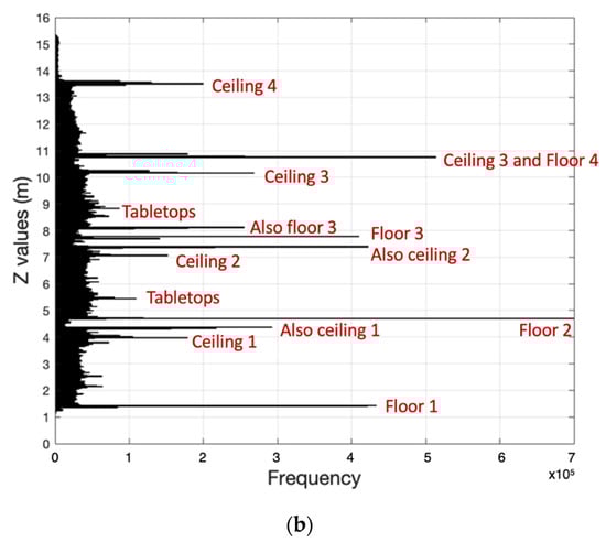 A cross section of the main building and the annex of the Old Sun School is presented in Figure 12a, illustrating the multiple heights of the floor and ceiling of the third storey of the main building, as well as the overlap in heights of the third storey and the fourth storey of the main building. The significant level of clutter present in the building is also visible in Figure 12a. The complete vertical histogram for the Old Sun Main Building is presented in Figure 12b. The vertical histogram for the third storey of the Old Sun Main Building showing multiple floor and ceiling heights is presented in Figure 12b.