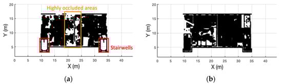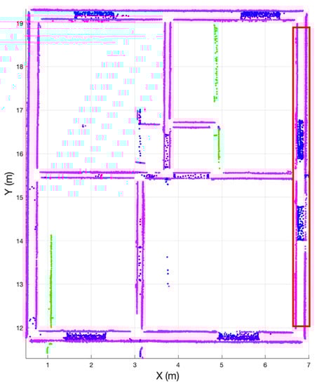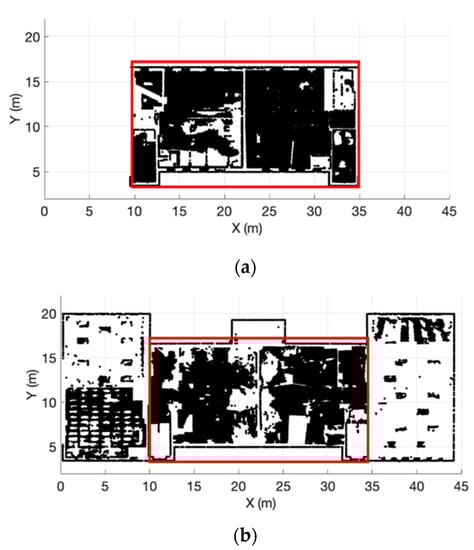 As seen in Figure 14b, the majority of the walls, windows, and doors have been successfully extracted by the automated method. Furniture located along the left central wall and the wall separating the kitchen from the rear room at the bottom of Figure 14b caused the algorithm to miss some wall segments. However, all the doors and windows were successfully extracted, with only one false detection, likely caused by the presence of clutter.