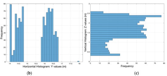 The door and window candidates are split into clusters based on a histogram of point density in both the horizontal and vertical directions. Using a manually determined bin size of 10 cm, consistent with the voxel size used earlier, histograms were computed for each series of points occurring between two neighbouring wall segments. Points are clustered if there are empty bins in the histogram occurring between full bins. In this way, the doors and windows are identified and false candidates are removed. An illustration of these vertical and horizontal density histograms is shown in Figure 7.
