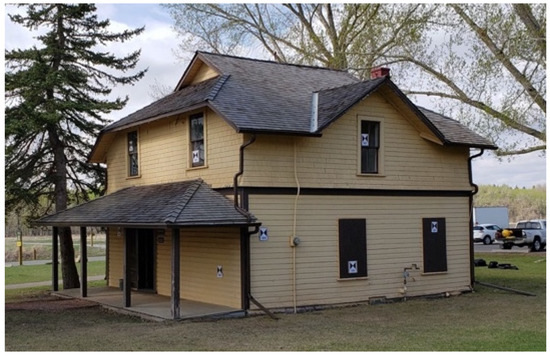 The second dataset used to illustrate the suitability of the developed algorithm to model heritage buildings is the Jobber’s House. Located in Fish Creek Provincial Park just south of Calgary, Alberta, the house was part of a larger ranch homesteaded in 1902. The name “Jobber” refers to the head herdsman who was responsible for repairs around the ranch. The building was scanned in May 2019. The terrestrial laser scan of the Jobber’s House took approximately eight hours, with a total of 40 scans. An image of the building captured during the scanning is included in Figure 9.