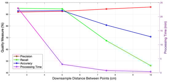It is clear from Figure 16 that the down sample distance of 5 cm was the best choice in terms of maximizing quality measures and minimizing processing time. The quality measures, including recall and accuracy, began to decline when the distance between points was larger than 5 cm. In addition, the processing time dropped off steeply from 2.5 cm to 5 cm, and then continued to decrease marginally.