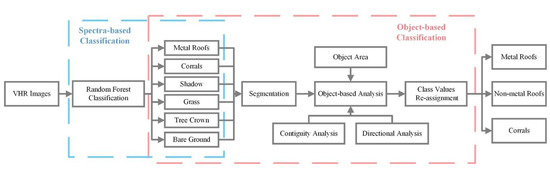 General workflow of the fused classification process for each of the VHR images. The blue and red boxes indicate the spectra- and object-based classification stages, respectively.