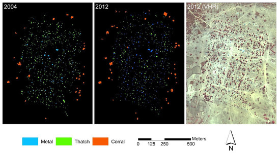 In contrast, Village 2, which rapidly increased in land area following a flooding event in 2003, had a much lower number of buildings in both 2004 (282) and 2012 (248) (Table 6). The extent of Village 2 expanded by 67% between 2004 and 2012, which was much larger than the expansion rate of Village 1 (14%). Considering the total number of buildings in Village 2 actually decreased during the eight-year period, this expansion occurred through a de-densifying distribution of buildings rather than the rapid growth of the total number of structures. Although Village 2 is considered a cohesive village, the housing units are considerably more dispersed and isolated, making it challenging to identify the boundaries of the settlement precisely. By 2012, Village 2 had a building density of ~6 buildings per ha compared to ~12 buildings per ha in Village 1. In 2004, only 39 buildings with metal roofs and 243 buildings with thatch roofs were mapped. By 2012, the total number of buildings decreased (−12%) primarily due to a sharp decline (−38%) in buildings with thatch roofs. Although there was substantial growth in the number of buildings with metal roofs (149%), the drop in the number of traditional housing units outweighed the gain in the improved building structures. The overall configuration of Village 2 is linear, indicating general village appearance and growth along a local road network. Although the corrals continue to be located on the periphery of the settlement, because of their linear structure they appear to be spread out within the village itself. Interestingly, the total number of corrals decreased between 2004 and 2012 from eight to five, although the total area occupied by corrals grew by 41%. Another noteworthy observation is that all but one of the corrals mapped in 2004 were not visible in 2012 and completely new structures were established in different locations (Figure 5). The major growth in the total area of corrals around Village 2 is attributable primarily to the establishment of a single large corral along the southwest boundary of the village. Similar to Village 1, there is no discernable spatial clustering pattern in the distribution of metal and thatch roofing across Village 2. Moreover, the spatial expansion of Village 2 is achieved through building out both traditional (thatch roofs) and modern (metal roofs) structures.