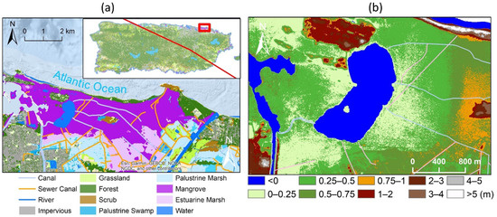 Our study area is the largest continuous mangrove forest in Puerto Rico (–65°56′, 18°26′30″) lying in the Northern Loíza municipality with a total area of 1660 hectares (from NOAA C-CAP map). Piñones State Forest was established here in 1918 around Piñones Lagoon which has slow exchange of water with the ocean. However, a stream from the southeast (Quebrada Blasina) and several canals, including those for sewage purposes in the east and south of the lagoon, provide freshwater and nutrients to the mangroves nearby (Figure 1a). Elevation (Figure 1b) around the lagoon varied from –0.5 to 4 m. However, the 5th and 95th percentiles of the 0.5 m DEM were 0.09 and 0.41 m, respectively. This State Forest hosts four major species of mangroves [31]. Red mangroves (Rhizophora mangle L.) with stilt roots live mostly near salty water or muddy environments. Black mangroves (Avicennia germinans L.) featuring long horizontal roots connecting numerous pneumatophores can grow in shallow water environment. Both red and black mangroves have high tolerance to salinity, while white mangroves (Laguncularia racemosa (L.) Gaerth.) and buttonwood mangroves (Conocarpus erectus L.) have moderate salinity tolerance [3]. These four species in general appear along an elevation gradient. Within the forest, red mangrove grows on the verge of the lagoon, black mangrove and white mangrove occupy the most area, and buttonwood mangrove is only found in spots with higher and drier conditions [32].