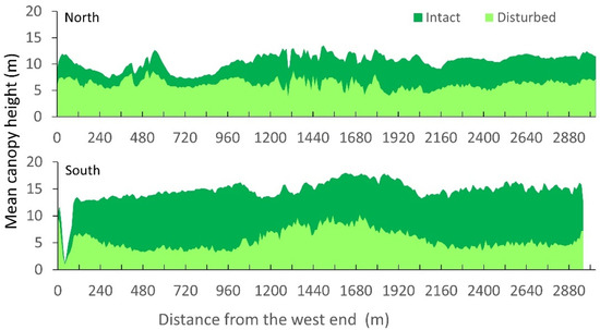 Canopy height averaged over the width of the transects also showed a distinct comparison of reduction by the hurricanes between the two transects with more reduction in the south than in the north (Figure 3). Within the north transect, the intact canopy height in the west was lower than that in the east, and the canopy height reduction in the west was less severe than that in the east.