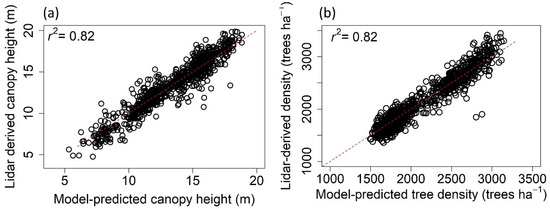 Model-predicted intact canopy height versus LiDAR CHM (a), and model predicted intact tree density versus LiDAR-detected tree density (b).
