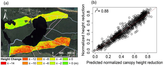 Canopy height change by the hurricanes calculated as disturbed minus intact canopy height (a), and model-predicted versus LiDAR-derived normalized canopy height reduction (b).