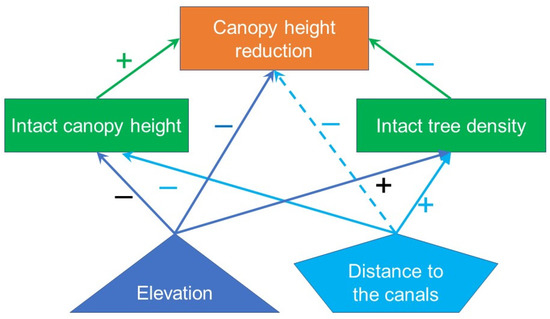 We summarized the connections among the spatial variables in Figure 7: Not only did the elevation and the distance to the canals significantly contribute to the spatial patterns of the intact canopy height and tree density, which in term significantly contributed to the spatial pattern of canopy height reduction, but also they directly affected canopy height reduction, the signs in Figure 7 indicate the directions of the effects.