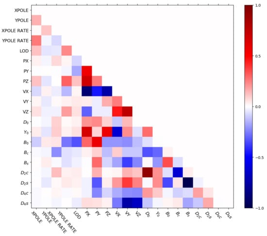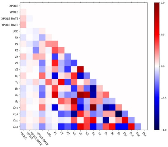 To investigate the correlation between ECOM SRP parameters, Figure 2 and Figure 3 show the correlation coefficients in the E2DYB solution among the estimated satellite dynamic parameters of G067, a BLOCK IIF satellite, and EPRs () during noneclipsing and eclipsing seasons, respectively. We can see that in both higher and lower angles, the term is highly correlated with the and terms, with correlation coefficients larger than 0.9 and 0.6, respectively, and the correlation between and term is close to −1, which means that they are highly correlated. Similar correlation can also be observed for the BLOCK IIR satellites (not shown here). Comparing Figure 2 and Figure 3, we can see that the correlation coefficients are higher in eclipse seasons, i.e., the coefficients between and , and and at lower β angle are larger than that at the higher . Consequently, the SRP parameters in the D direction can be hardly separated from the parameters in the Y and B directions, as is the interaction between the different ECOM parameters when satellites are at lower angle.