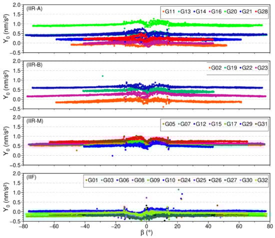 Figure 4 presents the time series of estimated for all BLOCK IIR and BLOCK IIF satellites in the E1DYB solution. The BLOCK IIR satellites show a larger value than the BLOCK IIF satellites, which exhibits as a constant acceleration along the satellite Y-axis, that is, the Y-bias. As the accelerations caused by yaw bias are related to the Sun irradiation, the term can be omitted as Equation (8) represented if it is dominated by the yaw bias. The magnitude of perturbations caused by the yaw bias for BLOCK IIR satellites is about 0.15 [], which is consistent with the behavior of Galileo Full Operational Capability (FOC) satellites [,]. However, most of the estimated coefficients for BLOCK IIR satellites are larger than 0.5 , indicating that there are possible thermal forces in the Y direction. Taking unmodeled non-SRP forces, Equation (9) is more reasonable than Equation (8). It is noteworthy that the highest dispersion is visible for the legacy BLOCK IIR-A and BLOCK IIR-B satellites (the upper two panels in Figure 4), and the largest difference is greater than 0.4 , whereas the variation of the coefficient is less significant for Block IIR-M and BLOCK IIF satellites (the lower two panels in Figure 4). This diversity means the magnitude of thermal forces are different between the BLOCK IIR-A, BLOCK IIR-B, and BLOCK IIR-M satellites.