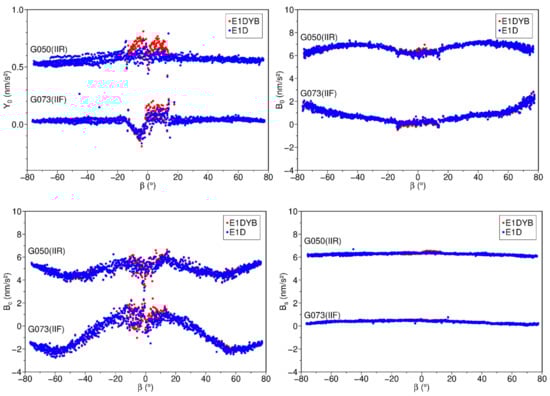 For a further comparison of Equations (8) and (9), taking SVN G050 (BLOCK IIR) and G073 (BLOCK IIF) as an example, the estimated coefficients in the Y and B directions derived from the E1D and E1DYB solutions are shown in Figure 5. The coefficients of SVN G050 in the B direction are shifted by 6 for better view. As we can see, the estimated coefficient derived in the E1D solution shows less scatter between the phases in and out of eclipse seasons. A similar pattern was also reported when an a priori box-wing model was used (see Figure 15 in []). It indicates that BLOCK IIR satellites have a relatively noticeable thermal radiation in Y surfaces. In addition, the estimates of BLOCK IIF satellite (SVN G073 in Figure 5) have a visible linear trend during eclipse seasons and are reduced after the angle switches the sign (see Figure 4 in []). This needs further investigation. In contrast to the of BLOCK IIR satellites, the trend of (for instance, SVN G073) shows larger variation.