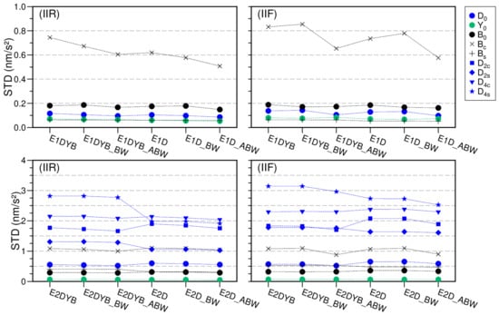 Furthermore, the standard deviation (STD) values of SRP parameters in the 12 solutions are given in Figure 6. For the ECOM1 solutions (that is, using ECOM1 as the parameterization model) shown in the upper panels of Figure 6, the STD of the (marked with black X-cross) is improved when an a priori box-wing model is used or a shadow factor is applied only in the D direction, except for BLOCK IIF satellites, whereas other coefficients have comparable STD values between different solutions. The STD difference of between solution E1DYB and solution E1D_ABW is around 0.2 for BLOCK IIR satellites and BLOCK IIF satellites. As for the ECOM2 solutions (that is, using ECOM2 as parameterization model) shown in the lower panels in Figure 6, the STD values of do not show any significant reductions either using box-wing models or adding the shadow factor only in the D direction, that is, between E2DYB and E2D_ABW solution. Compared with the ECOM1 solutions, all SRP coefficients in ECOM2 solutions show lower stability except for the term, and the STD values of the second and fourth order periodic terms are greater than 1 in the ECOM2 solutions. A noticeable decline of (blue star) is found when the shadow factor is applied only in the D direction and shows similar but smaller decline.