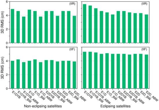For the BLOCK IIR satellites, the orbit precision of E1DYB_ABW and E2DYB_ABW, in which ECOM1 or ECOM2 parameterization model is combined with the a priori adjustable box-wing model and the shadow factor is applied in the D direction, is better than 4 cm for of the noneclipsing satellites, and close to 4 cm for eclipsing satellites. As for the BLOCK IIF satellites, using the adjustable box-wing as an a priori model slightly improves the orbit precision, whereas using the box-wing degrades the orbit precision. Therefore, the solutions using the box-wing model are not discussed in the following analysis.
