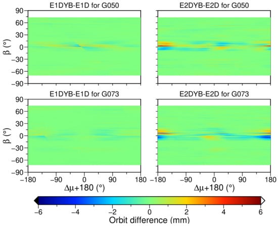 Taking SVN G050 (BLOCK IIR) and SVN G073 (BLOCK IIF) as an example, Figure 8 presents the radial orbit differences between solutions with the shadow factor applied in the D direction and those in the DYB directions. The along and cross components are not given here because the satellite–Sun direction and radial direction of a satellite are close to collinearity when the satellite enters the eclipse season for lower angle. As shown in Figure 8, orbit differences between two methods of using the shadow factor are observed at lower angle, in which the differences based on ECOM2 are more visible. When is around (), that is, the orbit noon, the orbit differences are negative at lower negative angle and positive at lower positive angle. Note that BLOCK IIF satellites show a more visible pattern than BLOCK IIR satellites because of the higher periodic terms in the D direction.