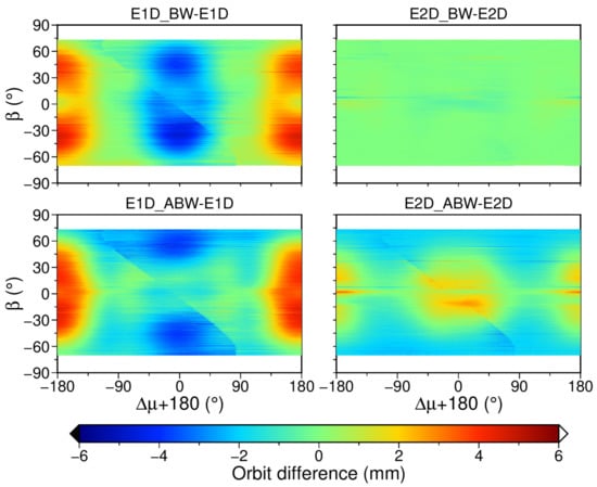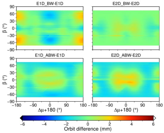 In addition to the BLOCK IIR satellites, the orbit radial differences of the BLOCK IIF satellites (SVN G073) are further investigated in Figure 10. As it is shown, the differences caused by applying a priori box-wing model are largely reduced compared with corresponding results of BLOCK IIR satellites shown in Figure 9. Note that when using the ECOM2 as parameterization model, the visible differences at lower angle between with and without an a priori adjustable box-wing model may be related to the adjustment of shape value in the adjustable box-wing modeling [].