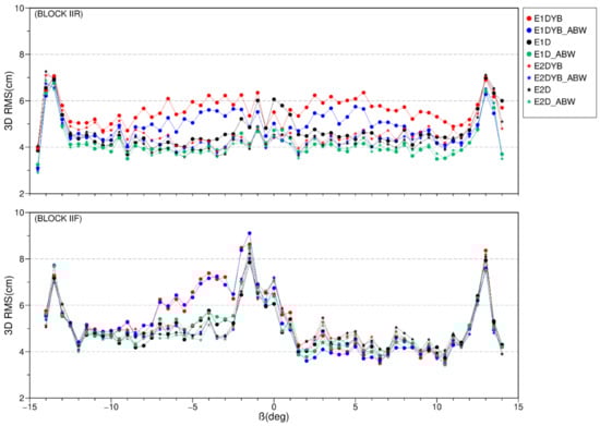 Due to fact that current box-wing model has a little improvement on BLOCK IIR satellite orbit precision, even a negative effect on BLOCK IIF satellites, we focus on the evaluation of adjustable box-wing model and the methods of applying the shadow factor. The 3D RMS values of DBD with respect to angle for eclipsing satellites in different solutions are shown in Figure 11. For BLOCK IIR satellites shown in the upper panel, RMS values of DBD in E1DYB (red dot) and E1DYB_ABW (blue dot) solutions increase with declining during the eclipse period. Applying the shadow factor only in the D direction removes the rising trend mostly for , that is, the E1D (black dot) and E1D_ABW (green dot) solutions. However, in the E1D solution, the RMS values still increase in the case of lower β angle, that is, . By using the ECOM2 instead of the ECOM1 and applying the shadow factor in the D direction, the RMS values are reduced to a large extent. Note the relatively larger RMS values of DBD up to 6–8 cm for both BLOCK IIR and BLOCK IIF satellites at the beginning of eclipse events, that is, .