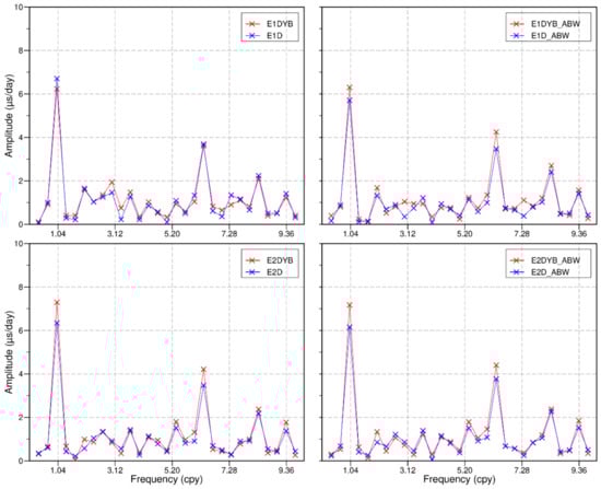 Figure 12 further presents the power spectra of the LoD in eight solutions, which demonstrates the impact of the SRP modeling. A clear reduction in the 1.04 cpy and 6.30 cpy signals is observed when applying the shadow factor in the D instead of the DYB directions. The only exception is when using the pure ECOM1 parameterization model without an a priori model, that is, between E1DYB and E1D, where the 1.04 cpy signal is larger in the E1D solution than in the E1DYB solution.