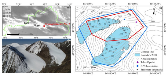 Location of Urumqi Glacier No. 1 in Xinjiang, eastern Tien Shan (a). A photograph of the glacier taken by a UAV in April 2018 (b), and the extent of the UAV surveys on 24 April and 26 August 2018 are marked on the topographic map with the red and blue polygons, respectively (c).