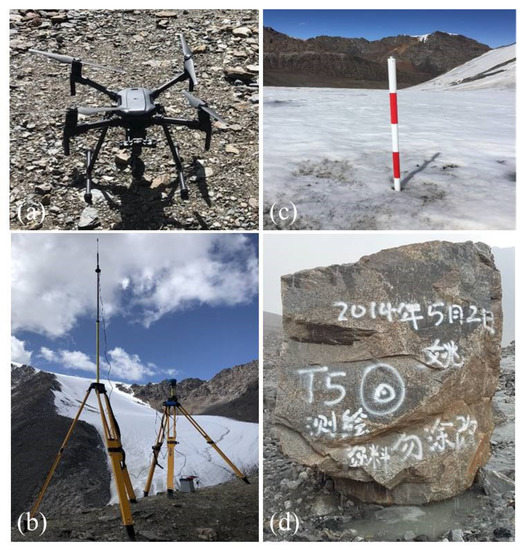 The (a) UAV platform, (b) GNSS survey, (c) ablation stakes, and (d) stationary landmarks to the terminus of Urumqi Glacier No. 1 used in this study.