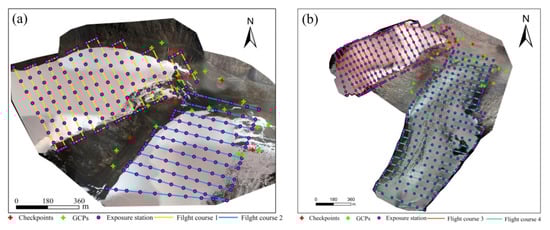 UAV flight coverage areas on orthomosaic images of Urumqi Glacier No. 1 on 24 April 2018 (a) and 26 August 2018 (b). The red crosses and green crosses indicate the checkpoints and Ground Control points (GCPs), respectively.
