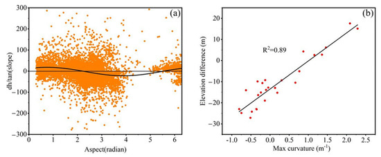 Scatterplots of the (a) aspect vs. slope standardized elevation differences, and the (b) maximum curvature vs. elevation difference for the period from Aug.-DEM to Apr.-DEM.
