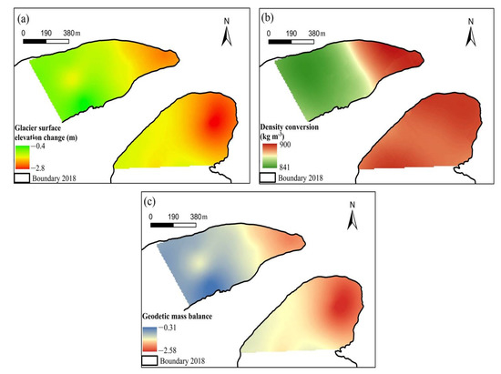 The geodetic mass balance was calculated by multiplying the changes in the spatially distributed glacier surface elevation with the corresponding distributed density conversion. The measured changes of glacier surface elevation over the survey area varied from −2.8 to −0.4 m during the period from 24 April to 26 August 2018 based on the two UAV surveys (Figure 5a). The mean elevation change was −1.64 m, with the standard deviation of 0.2 m. The interpolated density conversion indicated that the density was between 841 kg m−3 and 900 kg m−3 (Figure 5b). The derived geodetic mass balance was between −0.31 and 2.58 m in water equivalent (Figure 5c), with the mean value of 1.39 m w.e. It can be seen from Figure 4 that obvious differences exist between the West and East branches. The reason for this is that the repeat UAV survey area covered a smaller area of the East Branch tongue, but a larger part of the West Branch (see Figure 1); thus, elevation decrease is larger and surface density is apparently higher in the East Branch than in the West Branch.