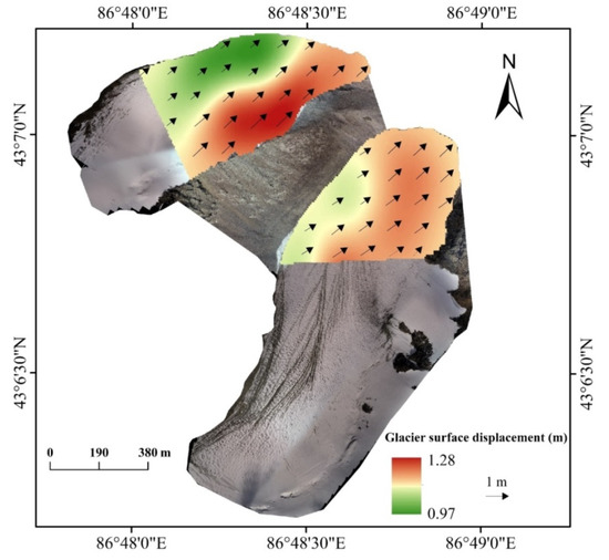 Figure 6 shows the distribution of the glacier surface displacement derived from the comparison of the two orthomosaic images from the UAV surveys during the ablation season in 2018. According to this figure, the mean, maximum, and minimum displacements are 1.1 m, 1.28 m, and 0.97 m, respectively. Then, the surface velocity distribution could be obtained by dividing the time interval by the displacement. The calculated mean surface velocity is 3.3 m/yr and the maximum and minimum values are 5.7 m/yr and 2.9 m/yr, respectively. Figure 6 also indicates that the spatial change of the velocity is less in the East Branch than in the West Branch.