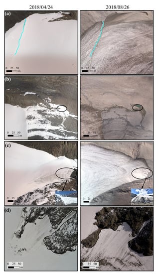 Details of changes in the selected area of the Urumqi Glacier No.1. The left column shows orthomosaic images from 24 April 2018. The right column shows orthomosaic images from 26 August 2018. The blue line represents the supraglacial river on East Branch, and the black circle and line show the same places captured in April and August 2018.