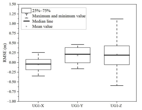 Box plots of the error of check points in the x, y, z directions. The horizontal lines represent the median value, boxes show the upper and lower quartiles, and whiskers indicate minimum and maximum values.