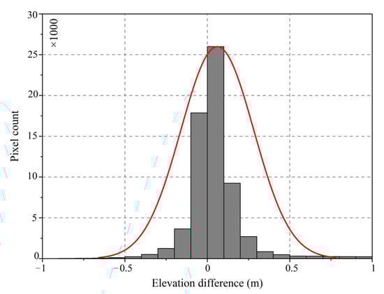 The vertical accuracy of the difference between the Apr.-DEM and Aug.-DEM was assessed by comparing the elevation difference in the non-glaciated area, assuming that the topography was unchanged. As shown in Figure 9, the accuracy was with decimeter accuracy, with a mean value of 0.2 m for the ablation season. Such decimeter-scale uncertainty supports the acquisition of the glacier elevation changes and surface velocity according to [17]. Another important factor here is that the same co-registration area still changes due to the inflow of the glacier meltwater and the modification of the sediment.
