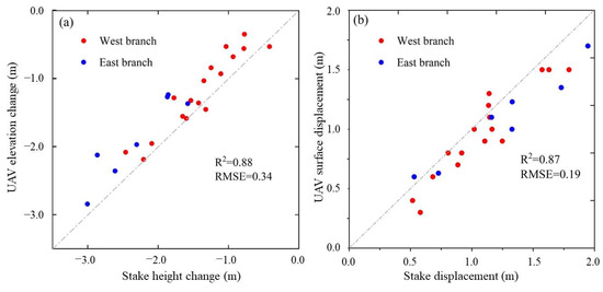 The stake observation results were used to objectively assess the accuracy of the surface elevation change from the UAV survey. Figure 10a shows a scatter plot of the observed change in stake height against the elevation change from the UAV survey at the corresponding site. The points in the figure scatter with a little upward deviation to the 1:1 line, with an R2 value of 0.88, which means that the elevation change is a little underestimated from the UAV survey in general. A comparison of the results of the stake measurement and the UAV survey produces a mean difference of 0.26 m and a relative error of 15.7%. The result also shows that relative error is lower on the West Branch (14.3%) than on the East Branch (18.2%), suggesting that error decreases with an increase in the measured point since there are 17 stakes on the West Branch and only 7 stakes on the East Branch in the survey area.