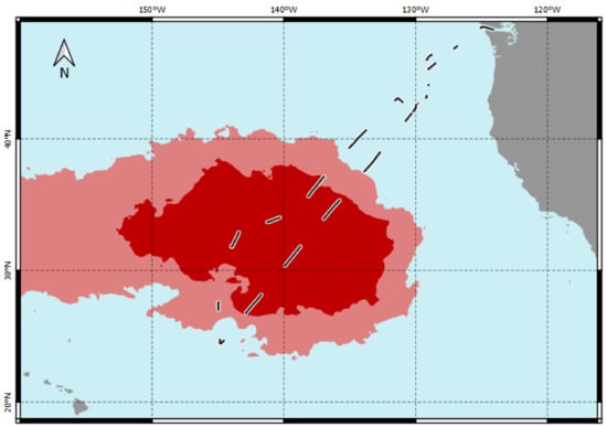 Map of the photo footprints (black lines) during mission NPM3. The gaps are mainly caused by transit during nighttime, at which no photos were recorded. The light and dark red shaded polygons indicate the estimated outer and inner areas of the Great Pacific Garbage Patch (GPGP), respectively [10].
