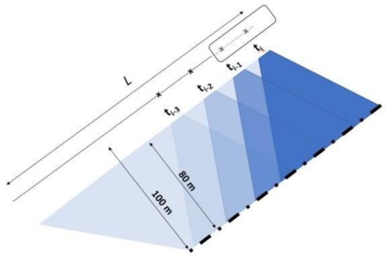 Illustration of a one-sided photo transect, showing the length L, the different timestamps tx, and the cut-off perpendicular distance (heavy dashed line) inferred from the data. At a 2 s interval and 10 knots speed, the photographed areas will overlap.