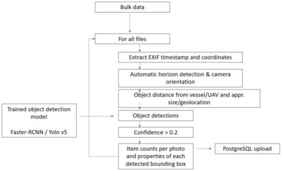 We modified and embedded the Tensorflow and Pytorch object detection APIs into a batch script (Python 3.7) that performs the steps according to the flowchart in Figure 4. The program’s horizon detection and camera orientation part is based on a Matlab toolbox developed by [51] and was adapted for inclusion in the Python software.