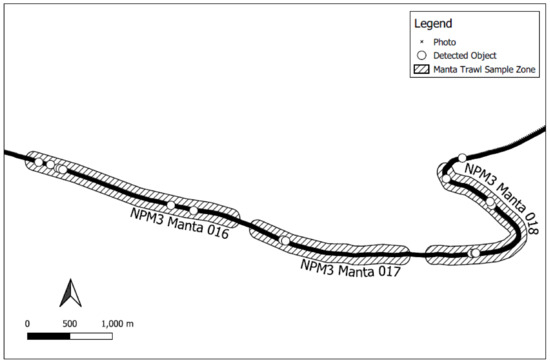 Map highlighting the comparison of three example Manta trawl samples with camera surveys. The black line indicates the camera GPS tags, a concatenation of individual markers. Each black hatched areas indicate a Manta Trawl Sample Zone, a 100 m (each side) buffer around each Manta trawl trajectory. White bubbles indicate the locations of unique identified floating macroplastic objects. The GIS processing attributes the number of detected objects to each sample zone as well as the total number of photographs taken.